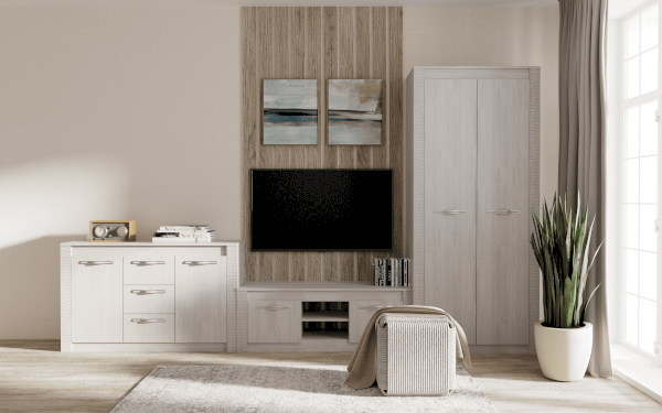 Стильная и лаконичная тумба пот ТВ Монако станет украшением вашей гостиной. Модель выполнена в едином стиле с другими модулями мебельной коллекции Монако. Она изготовлена из высококачественной ЛДСП цвета белого ясеня и имеет декоративную отделку фасадов из МДФ. Изделие состоит из двух центральных открытых ниш, а также полок, спрятанных за распашными дверцами. На столешнице вы сможете разместить телевизор, а в зонах хранения – необходимые вещи и технику.