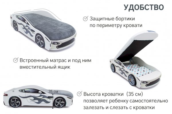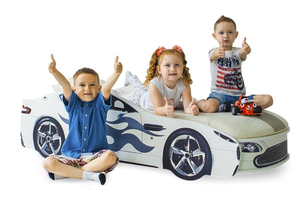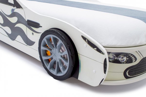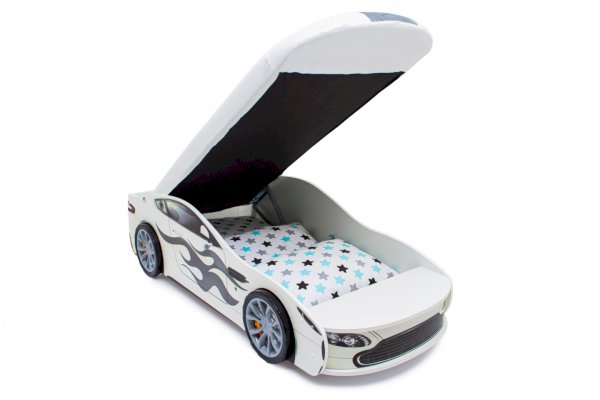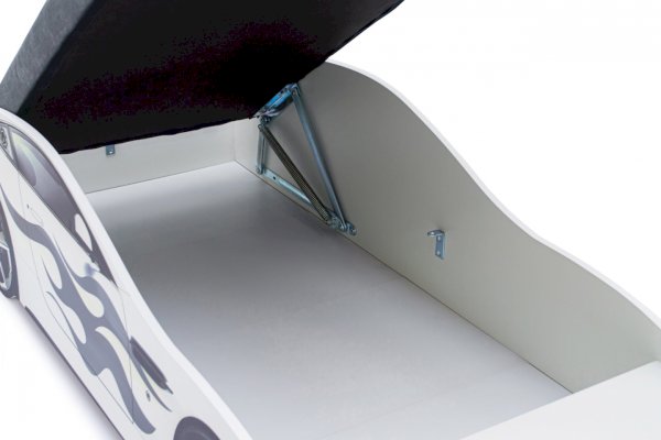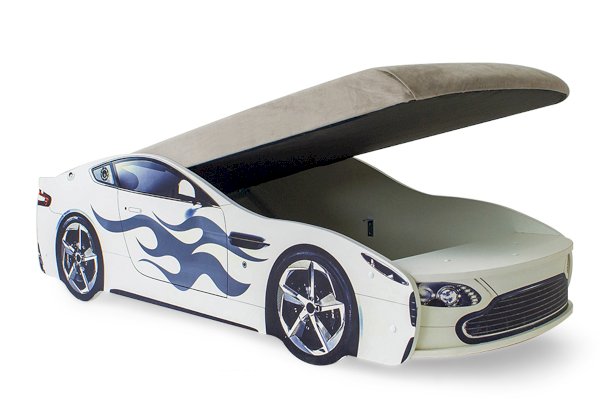 Кровать-машина “Бондмобиль”  для детей от 2 до 10-12 лет, идеально подойдёт и для мальчиков, и для девочек. Кровать выполнена из экологичного ЛДСП, имеет прочное основание из цельной плиты ЛДСП 16 мм. Кроме того, предусмотрен подъёмный механизм с пружиной, дно поднимается и опускается очень плавно. В комплекте предусмотрен ортопедический матрас, а в основании размещен вместительный ящик, который удобно использовать для хранения белья или игрушек.