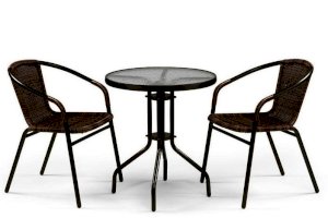 Комплект с двумя стульями с ротангом коричневого цвета и круглым столом.