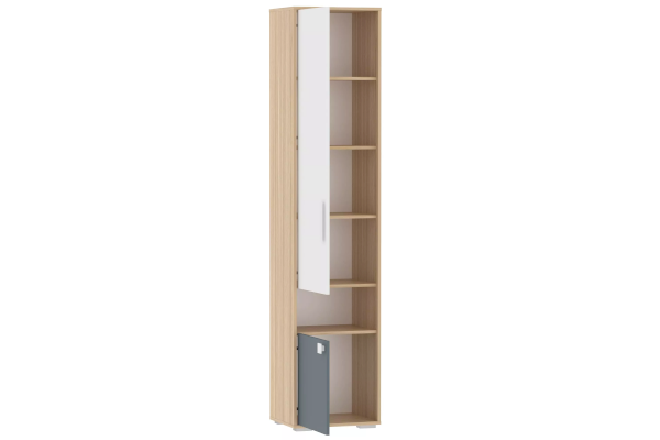 В шкафу можно удобно расположить книги, школьные принадлежности и игрушки. Высота полок фиксирована. Шкаф-пенал является модульным, что позволяет комбинировать его с другими предметами коллекции. Возможна право- и левостороння сборка.