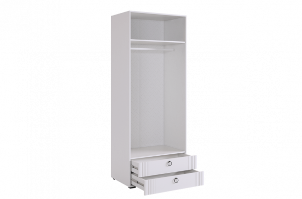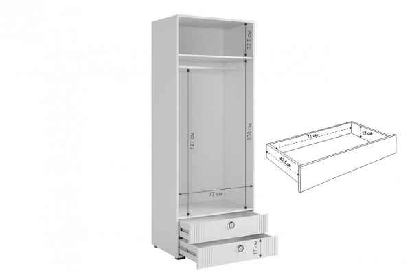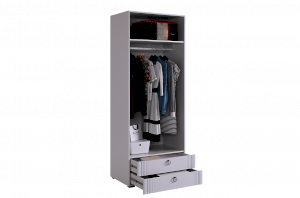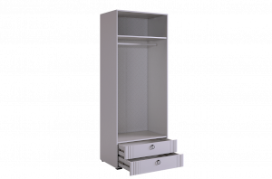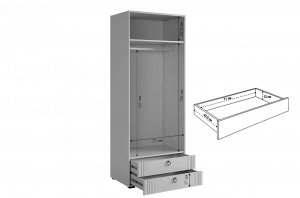 - Внутреннее наполнение включает штангу для одежды, полки и два удобных ящика с шариковыми направляющими.