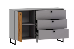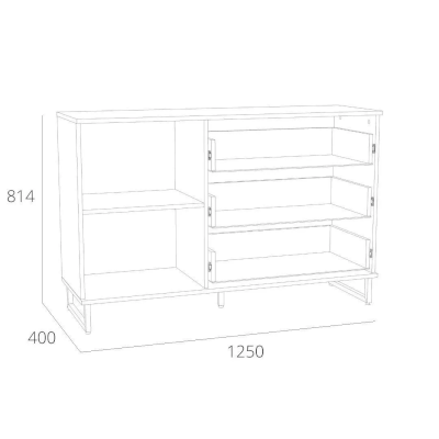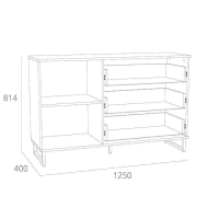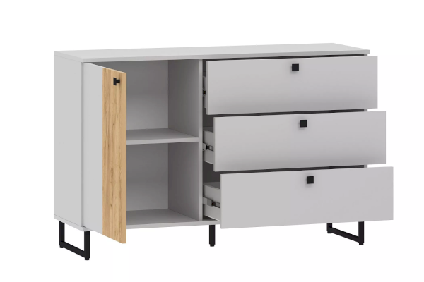 Тумба оснащена тремя ящиками, которые выдвигаются плавно и бесшумно благодаря шариковым направляющим и системе с доводчиком, а также двумя отсеками для хранения вещей, а высокие опоры обеспечивают быстрый и легкий доступ при уборке комнаты.