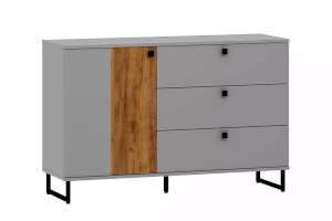 Коллекция БРУНО – это современный дизайн с характером, который отлично впишется в стиль лофт. Цвет платиново-серого и золотого дуба гармонично подчеркнут контрастными черными ручками и черными металлическими опорами.