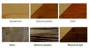 Дерево: массив сосны 20 мм, покрытое мебельным воском, цвета на выбор: бесцветный, клён, орех, красное дерево, морёный дуб, жженое дерево.