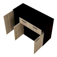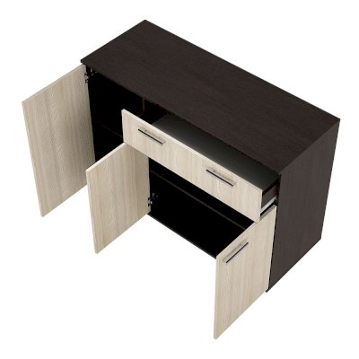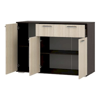Комод Стандарт №4 – очень практичное решение для вашего интерьера. Благодаря ширине в 1200 мм, он вместит в себя большое количество предметов и вещей. Модель состоит из трех секций: верхнего выдвижного ящика, левой части с распашной дверцей и нижней секции также с распашными дверцами и спрятанными за ними полками.