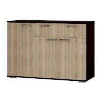 Комод Стандарт №4 выполнен из высококачественной ЛДСП в популярных цветах венге и лоредо, Оснащен удлиненными хромированными ручками геометрической формы.