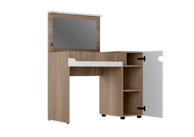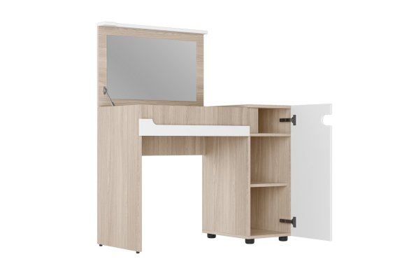 • Столик с откидной крышкой оснащен секцией с отделениями для хранения с зеркалом, и секцией с полками