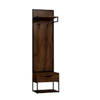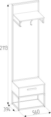 Открытая напольная вешалка поможет рационально обустроить даже небольшую прихожую, не загромождая пространство. Модуль состоит из вешалки, верхней полки, выдвижного ящика и открытой ниши. Полка для головных уборов крепится на профиль цвета Черный муар. Основание вешалки - профиль цвета Черный муар. Ящик оснащен шариковыми направляющими.