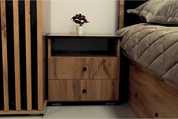 Прикроватная тумбочка содержит три отделения – открытую полку и два выдвижных ящика. Столешница имеет оптимальную высоту – такую, чтобы можно удобно и легко дотянуться и положить вещь, лежа в кровати. На тумбу можно поставить лампу, в открытую полку положить книгу, телефон, планшет – они будут одновременно и под рукой, но в то же время не будут вам мешать. В выдвижных ящиках хорошо хранить документы. Такие тумбочки обычно приобретают в паре – для нее и для него – и ставят по обе стороны двуспальной кровати. Если тумбочка женская, в выдвижные ящики размещают духи, косметику, дамские мелочи, если мужская – бумаги, ежедневники, гаджеты.