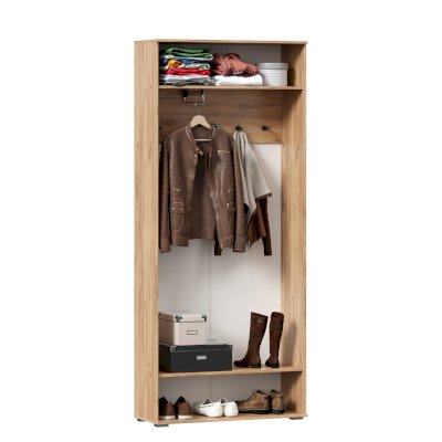 • За распашными дверями общее отделение с 2-мя полками ЛДСП (одна вверху, одна внизу шкафа – образуют ниши высотой 242 мм каждая) и выдвижной штангой