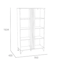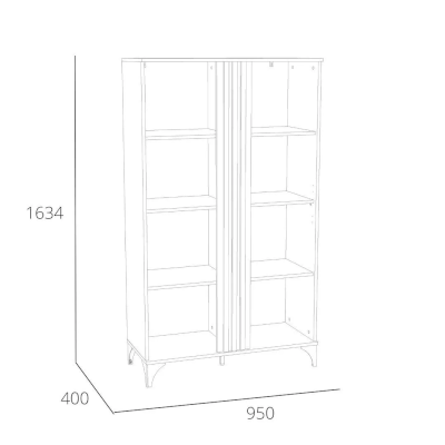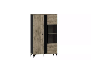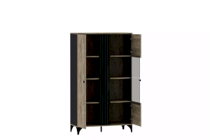 Шкаф оснащен двумя распашными дверьми с полками для хранения вещей. За фасадом из закаленного стекла можно расположить посуду, книги или элементы декора, а высокие опоры обеспечивают быстрый и легкий доступ во время уборки. Сборка шкафа универсальна – фасад-витрина может крепиться как на правую, так и на левую стороны.