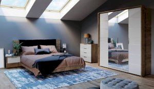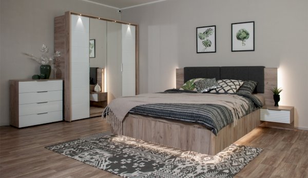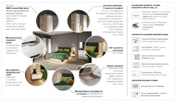 Спальня Джулия – новинка европейского рынка! Белый глянец на фрезерованных фасадах спальни отражает даже малое количество естественного света, делая ее намного уютней и светлей. Корпус из ЛДСП австрийского концерна Кроношпан с декором дуб крафт серый - цвет и текстура натурального дерева. Центральный элемент - двуспальная словно парящая в воздухе кровать, выполненная в простых и лаконичных формах с подсветкой снизу - самый актуальный дизайн современной спальни. Это свежее стилистическое решение, способное удивить родственников, друзей. Светодиодная подсветка служит дополнительным освещением в ночное время и создает романтическое настроение. Комбинированное мягкое изголовье с подсветкой - дополнительный комфорт, на него удобно опираться. Большой вместительный шкаф с точечной подсветкой и рамкой из ЛДСП 22мм. Современные торцевые ручки очень удобны в эксплуатации и надежно крепятся к фасадам.