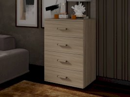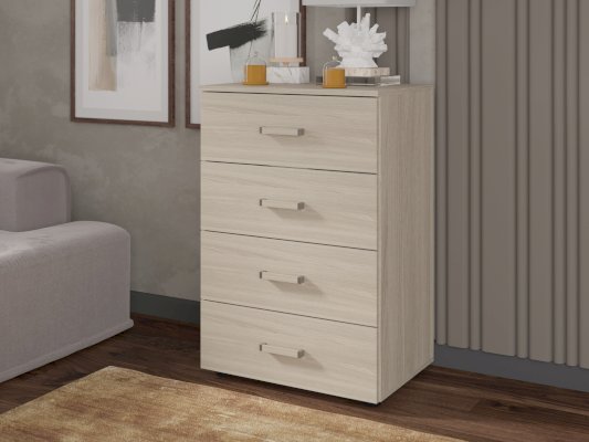 Высокий узкий комод оборудован четырьмя широкими выдвижными ящиками для белья и личных вещей. В небольшой комнате будет незаменим для организации хранения вещей.
