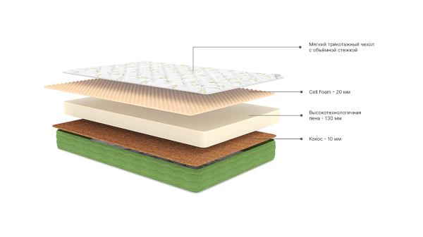 Наполнитель: Ячеистая пена с массажным эффектом «Body Comfort», монолитная плита ППУ, кокос