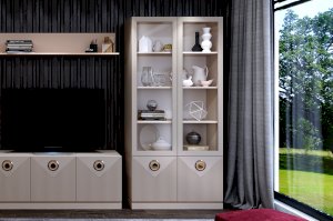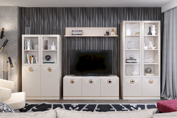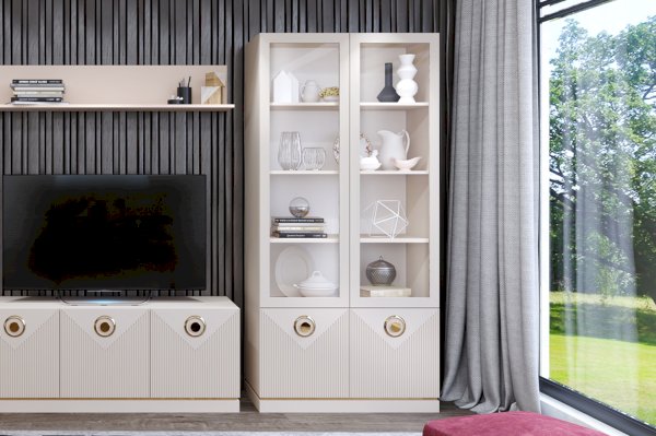 Шкаф-витрина выполнен в таких материалах как ЛДСП сатин и МДФ в матовой плёнке ПВХ с поверхностью soft touch. Лицевая фурнитура в цвете золото подчеркивает рисунок фрезеровки фасадов и делает мебель нарядной.