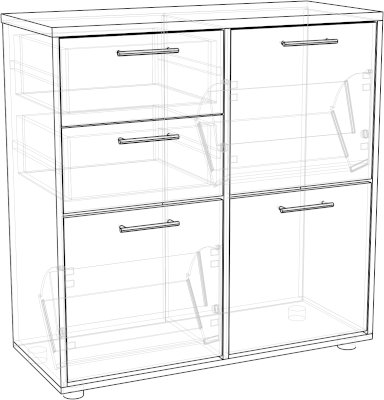 Тумба для прихожей имеет  2 отделения под обувь оснащенными обувными механизмами, два выдвижных ящика и нишу за закрытой дверкой для обуви или различных вещей.