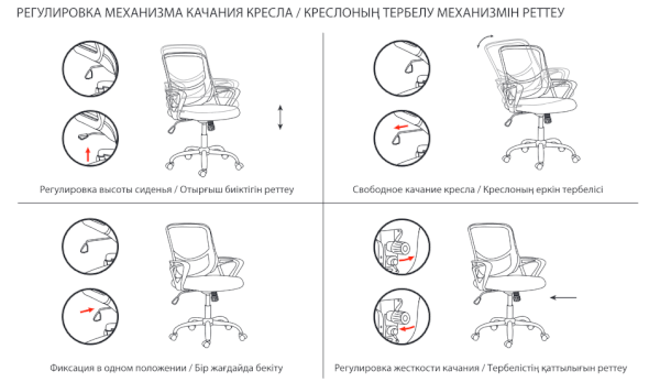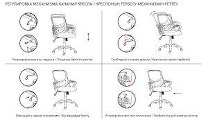 Кресло оснащено механизмом качания «топ-ган» с регулировкой под вес пользователя и возможностью фиксации спинки в рабочем положении.