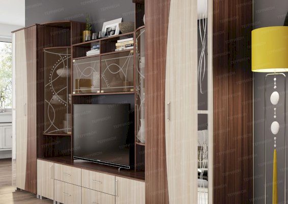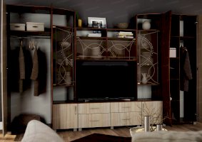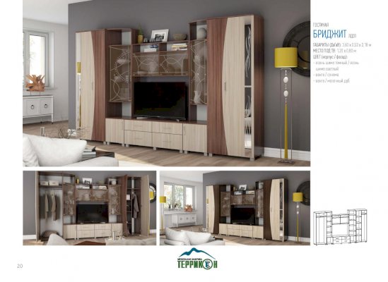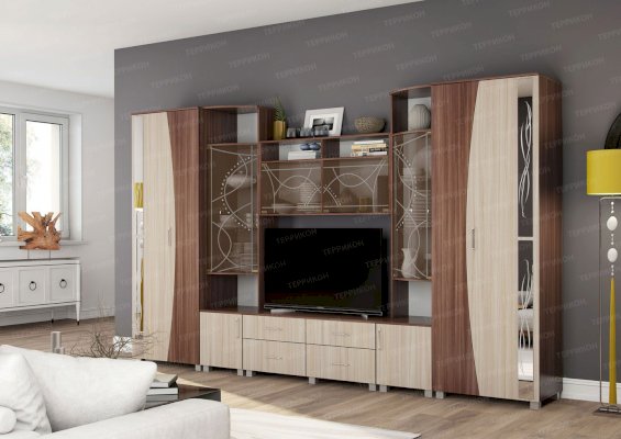 Артистичные, возвышенные натуры захотят приобрести гостиную «Бриджит». Ведь несмотря на крупные габариты, этот комплект мебели кажется изящным и невесомым. Ощущение легкости привносят в обстановку светлые оттенки, а также элементы из стекла и зеркал. Эффект устремленности вверх усиливают абстрактные рисунки, состоящие из тонких плавных линий.