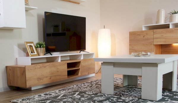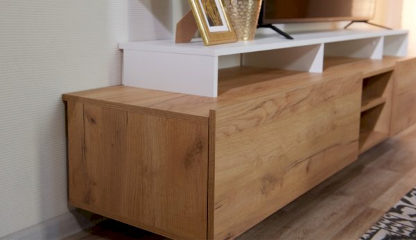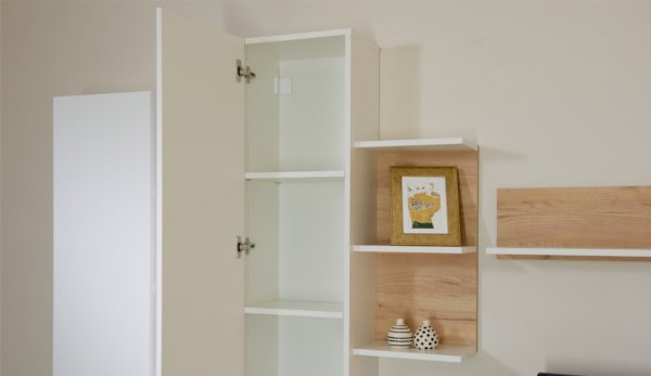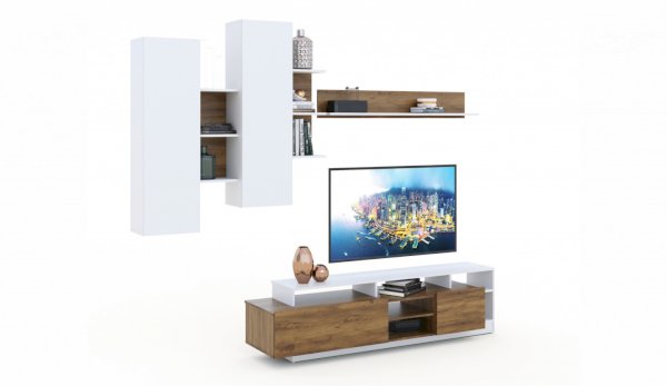 Стенка Невио-2 выполнена с использованием новейшего декора «Дуб крафт золотой» в сочетании с белым - подходит для стилистических направлений лофт, минимализм, скандинавский. Простые формы, естественные природные оттенки создают гармоничную и умиротворенную атмосферу гостиной. Четкая текстура дерева, белый цвет, отсутствие внешней фурнитуры, углубленный цоколь - создают визуальную легкость и компактность стенки. Фасады, выступающие на 1см поверх корпуса, заменяют ручки. Стенку дополняет вместительный комод с витриной. Мебель выполнена из высококачественных экологичных материалов.