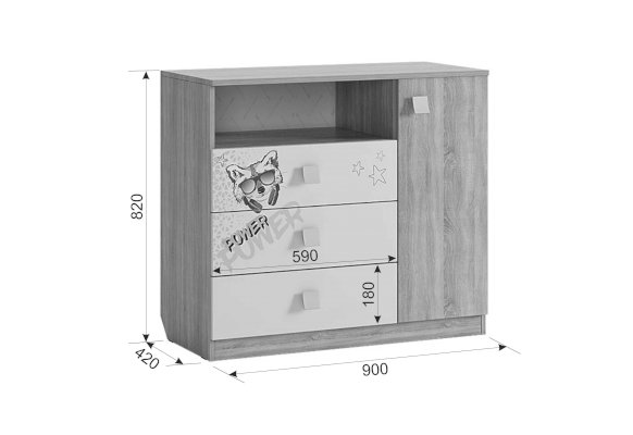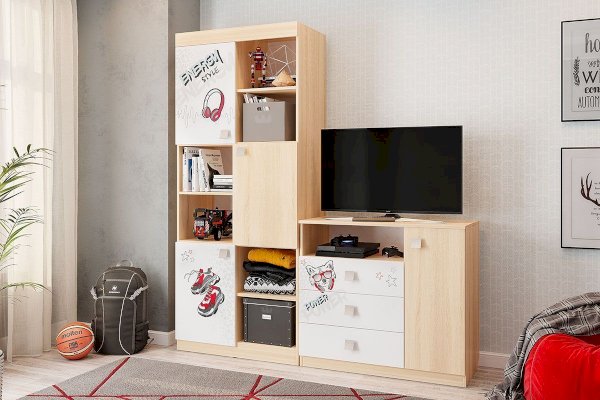 3 выкатных ящика, ниша и закрытые полки, все что нужно что бы разместить вещи вашего ребенка.  Эффектный принтерный рисунок на фасадах выдержан в общем стилистическом решении. Рисунок устойчив к истиранию и ультрафиолету. Открытая ниша для гаджетов, столешница толщиной 25 мм, на которой с легкостью поместиться большой телевизор.