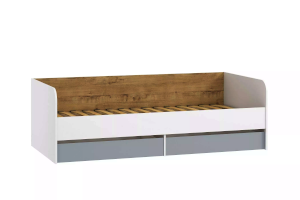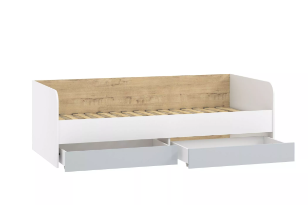 Односпальная кровать подходит для детской мальчиков и девочек в современном, скандинавском и стиле лофт. В кровати предусмотрены ящики для хранения постельного белья или игрушек. Натуральный материал ламелей не вызывает аллергии и безопасен для здоровья. Изогнутая форма ламелей придает основанию спального места большую прочность и дополняет ортопедические свойства матраса.