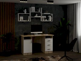 Письменный стол включает в себя вместительное отделение с закрытым фасадом, тумбу с тремя ящиками полного выдвижения и открытые ниши. Закрытое отделение состоит из полок, предназначенных для хранения личных вещей, а также книг, папок и прочих, необходимых для работы аксессуаров. Функциональная тумба содержит три выдвижных ящика, идеально предназначенных для хранения и систематизации всей вашей документации.