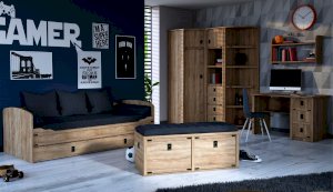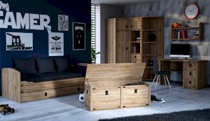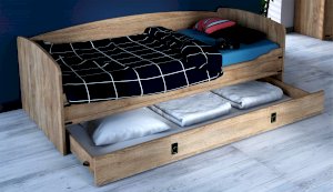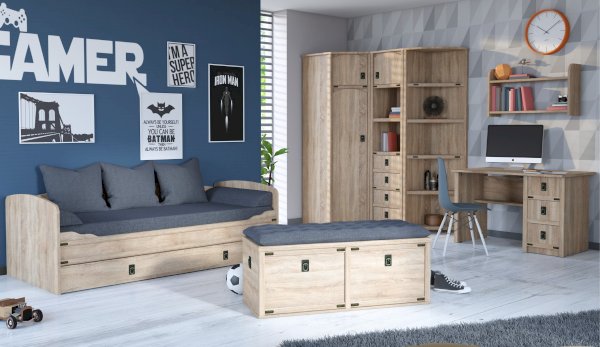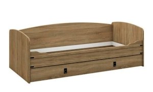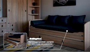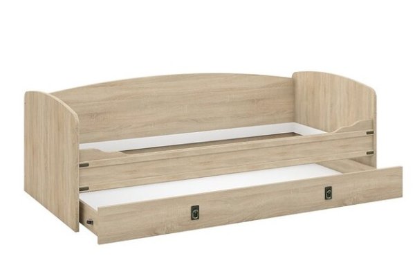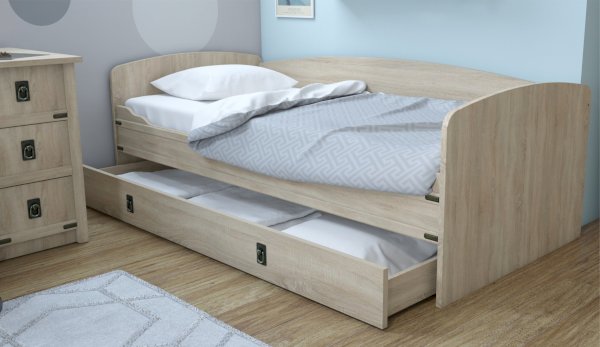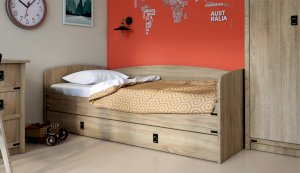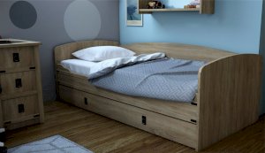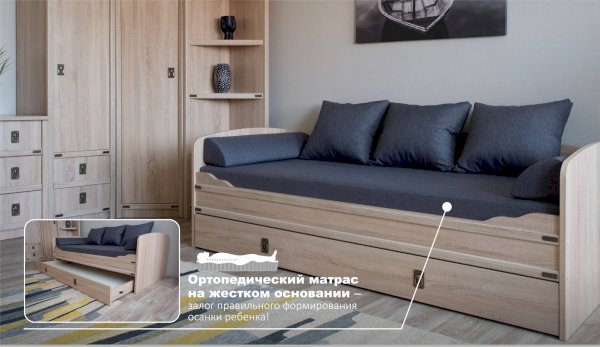 Кровать-тахта – со скругленным изголовьем и высокой спинкой имеет дополнительное спальное место, с помощью множества роликов его легко выдвинуть, можно использовать как ящик для белья. Мягкая кромка 2мм защищает края кровати от повреждений и сколов. Украшением служат стилизованные металлические ручки MARINE бронзового цвета и декоративные элементы в тон. В комплекте с декоративным матрасом и подушками превращается в молодежный диван. Пользоваться кроватью может взрослый и ребенок любого возраста, так как она имеет размеры стандартной кровати 90х200см, устойчивую конструкцию и нейтральный для интерьера цвет. Идеально компонуется со всеми модулями системы Валенсия.