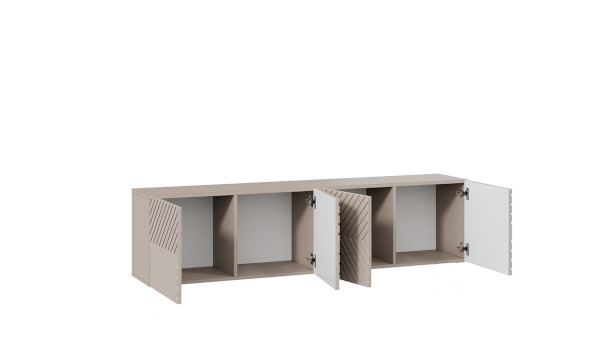 За привлекательными фасадами, которые открываются с помощью системы push-to-open, расположены четыре вместительные ниши, что позволяет разместить необходимые предметы и аппаратуру.