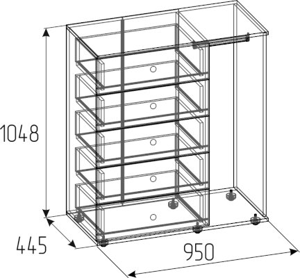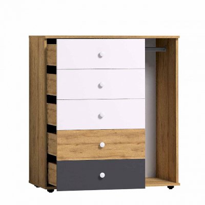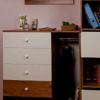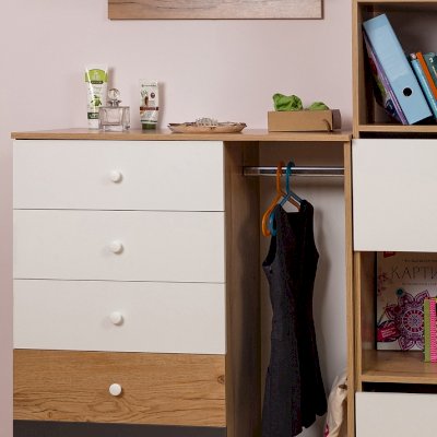 Все мамы знают, как непросто дается детям уборка и как, оказывается, «сложно» повесить в шкаф школьную форму и кофточку. Множество детских отговорок и как итог – испорченное настроение у обоих. Мы нашли компромиссное решение этой вечной проблемы: Комод с рядом выдвижных ящиков и со стационарной штангой в нише без фасадов для хранения школьной формы или домашней одежды. Оригинальный комод с открытой нишей необходим в каждой детской для хорошего настроения!