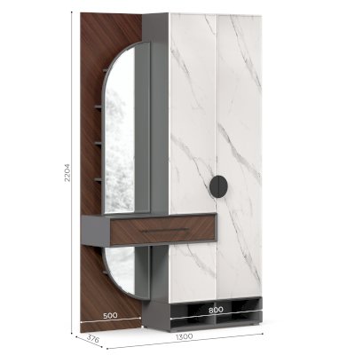 • Слева от шкафа вертикальный шит, вверху 4 полки за распашной дверью с зеркалом, внизу под ящиком полка за декоративной панелью с зеркалом