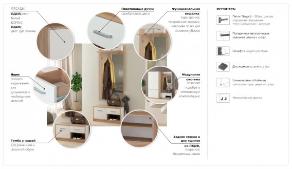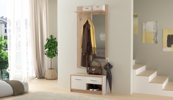 «Стелс» - это отличное, компактное и функциональное решение, если у Вас небольшая прихожая. Она включает в себя все самое необходимое. Вы сможете повесить одежду и сумку на вешалку, на верхнюю полку разместить шляпки и другие головные уборы, в нижнее отделение с полками поставить обувь и положить нужные для Вас вещи. А встроенное зеркало поможет перед выходом удостовериться, что Вы прекрасно выглядите.