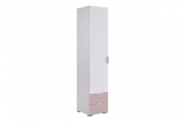 Шкаф изготовлен из прочного материала – лдсп белого дерева, а фасады выполнены из качественного мдф с использованием эмали цвета пудра розовая, добавляющей бархатистость и нежность. Вертикальные полосы на фасаде создают эффектный акцент с использованием фрезеровки.
