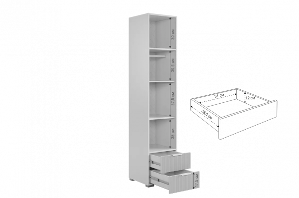 У шкафа два удобных ящика, оснащенные шариковыми направляющими для плавного и бесшумного закрывания фасадов. Благодаря универсальной сборке, можно менять открывание фасада влево или впрво. Наполнение можно менять: оставить полки или убрать их, чтобы повесить одежду на штангу.