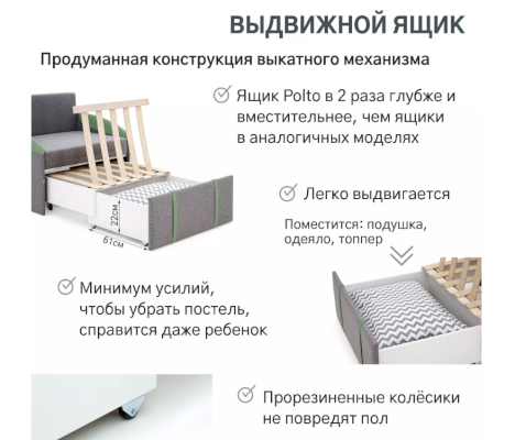 В кресле предусмотрен большой ящик. Благодаря особой конструкции ящик Polto в 2 раза глубже и вместительнее, чем ящики в аналогичных моделях. Поместится подушка, топпер и одеяло.