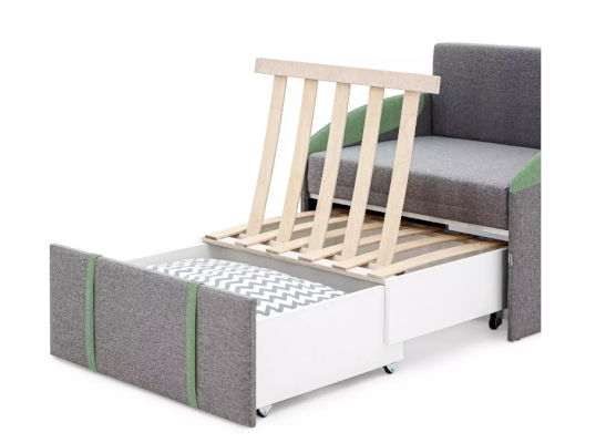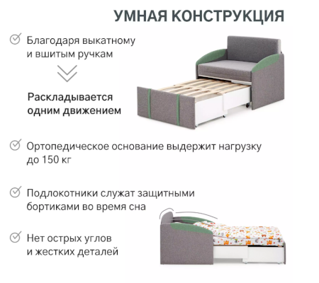 Ортопедическое основание, состоящее из 11 деревянных лат, выдержит нагрузку до 150кг. Подлокотники служат защитными бортиками во время сна. Нет острых углов, все детали мягкие.