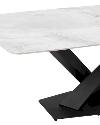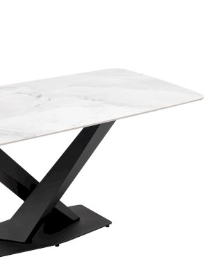 Столешница сочетает в себе прочную керамику, материал устойчивый к перепадам температуры, к чрезмерной влаге, любые загрязнения легко устранить. Поверхность повторяет рисунок изысканного мрамора, излучая комфорт и спокойствие. Каркас черного матового цвета изготовлен из прочного и долговечного МДФ. Основание из двух объёмных балок образует простую и надежную конструкцию. Роскошное сочетание цветов позволяет подобрать к столу любые комплекты стульев в современном стиле.