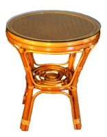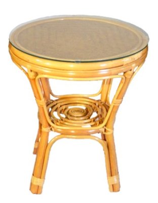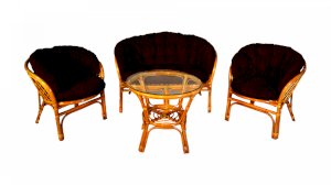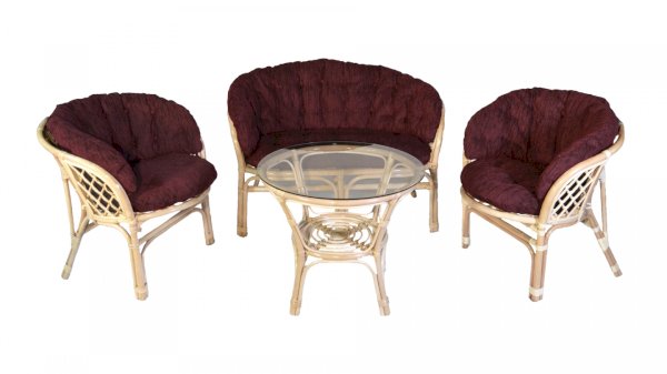 Комплект из натурального ротанга, состоящий из дивана, двух кресел и круглого столика со стеклом.