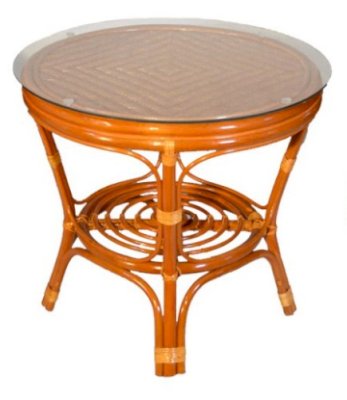 Комплект из натурального ротанга, состоящий из дивана, двух кресел и круглого столика со стеклом.