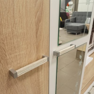 Компактный гарнитур «Лукас» – это функциональная стилизованная модель с простыми геометрическими формами и множеством полезного пространства. Контрастное сочетание фасадов белого цвета с древесной фактурой дуб сонома, а также отделка зеркалами станут ярким акцентом любого интерьера.